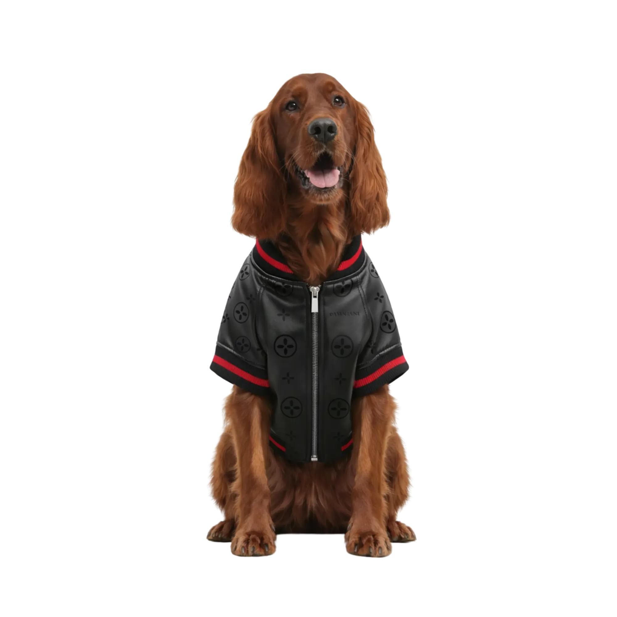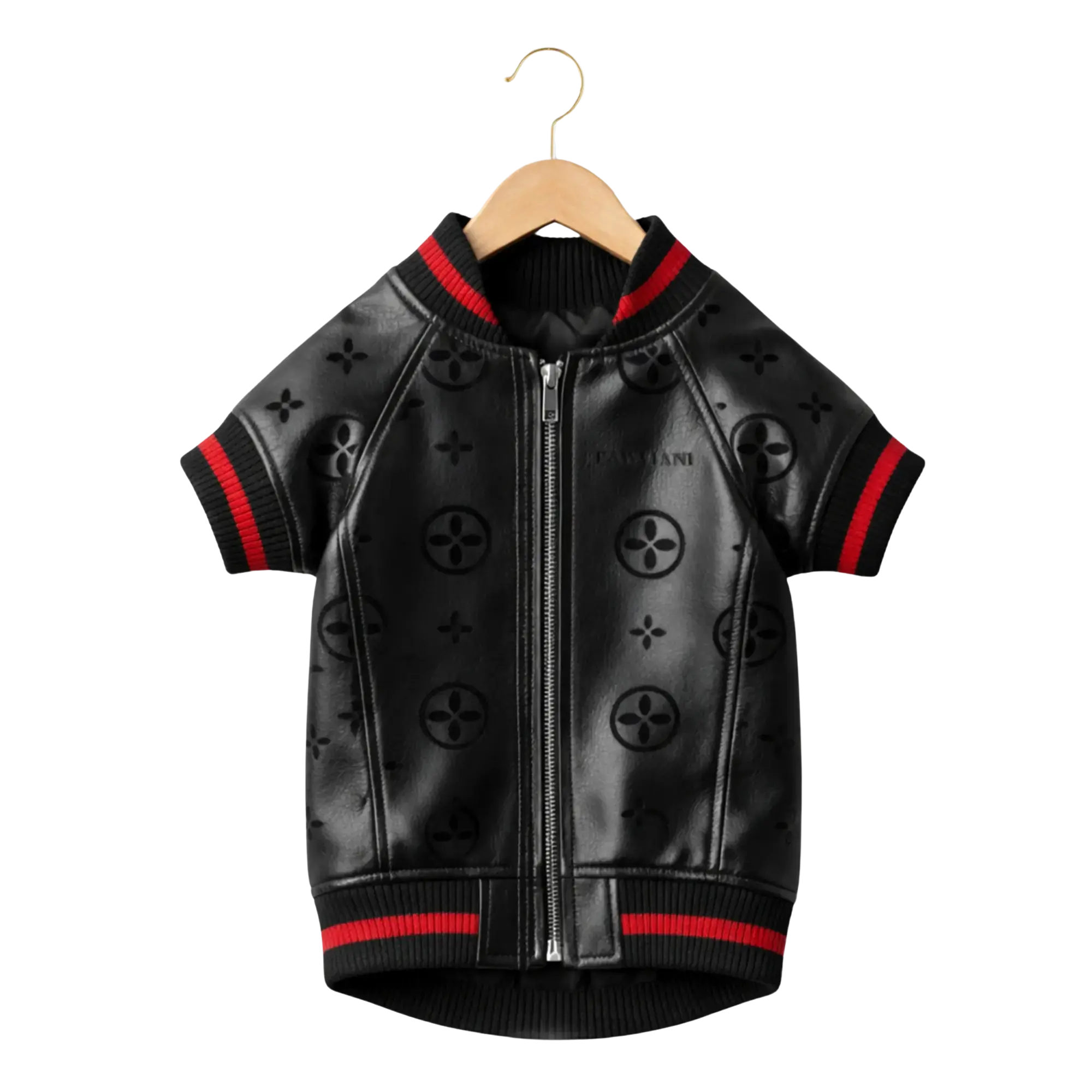 PAWVIANI BAVAI JACKET is a premium dog jacket crafted from fine-grained PU faux leather, elevated with all-over debossed monogram detailing for a bold and luxurious silhouette. Complemented by the iconic black–red–black rib knit collar, sleeves, and waistband, it delivers a sporty yet high-fashion aesthetic while sealing in warmth. The metal separating zipper, minimalist hardware, and precise tailoring make it perfect for city walks, stylish outings, photoshoots, and special occasions.